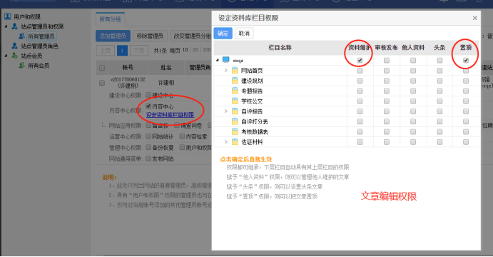 备注:若为审批人则还需要勾选“审核发布”。权限可细分到栏目,自定义设置即可。