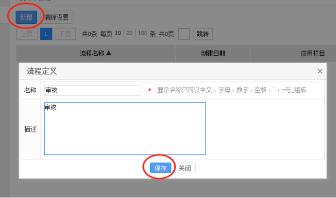 13. “新增”(填写审核流的名称)并“保存”
