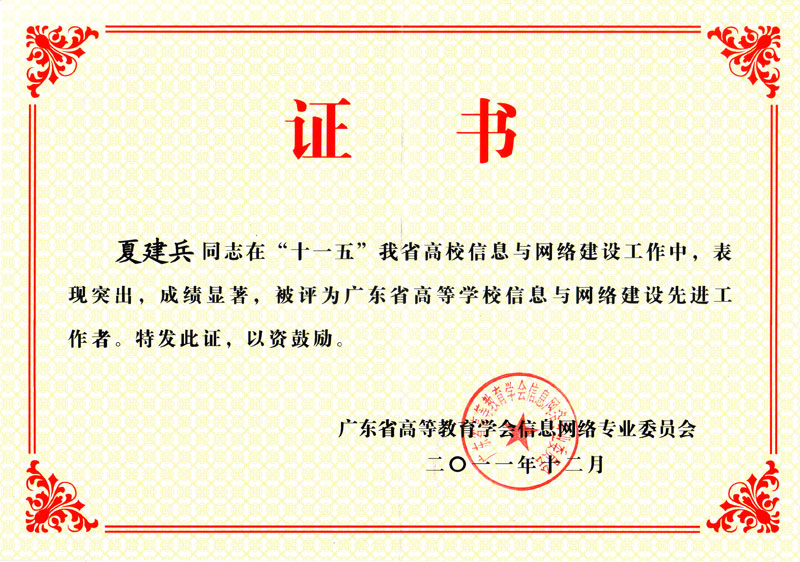 夏建兵主任喜获广东省高等教育信息与网络建设先进者荣誉称号。