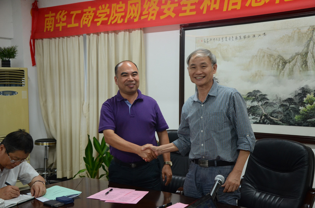 会议第二项议程:夏建兵主任宣读《南华工商学院校内信息系统与网站信息安全责任书》后,易江院长亲自与各院系和各部门一一签订《南华工商学院校内信息系统与网站信息安全责任书》。